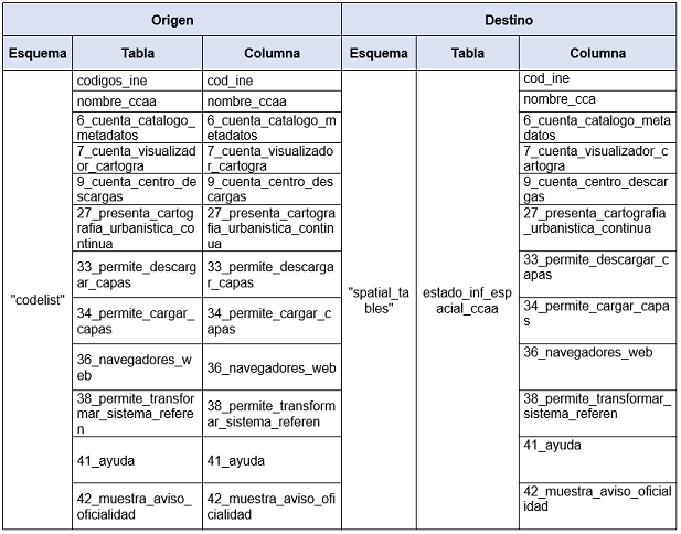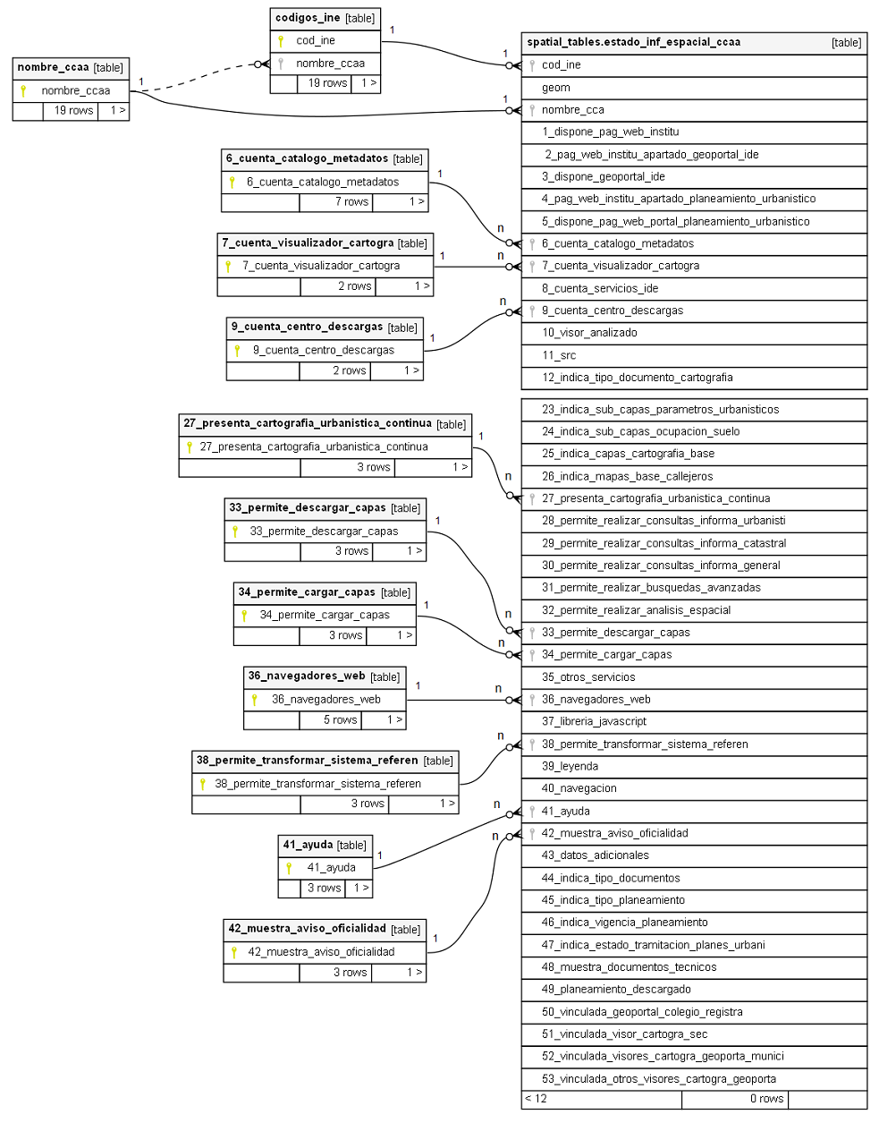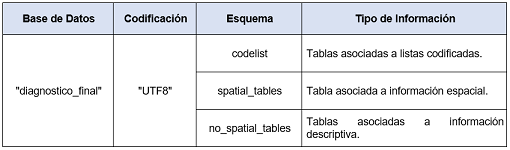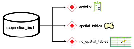 En términos generales, “diagnostico_final” es una base de datos espacial con codificación “UTF8”, conformada por tres esquemas o grupos: “codelist” (listas de valores utilizadas), “spatial_tables” (tabla de valores del análisis sobre las comunidades autónomas), y “no_spatial_tables” (tablas con los datos alfanuméricos recopilados), cada una con 12, 01 y 06 tablas respectivamente.
